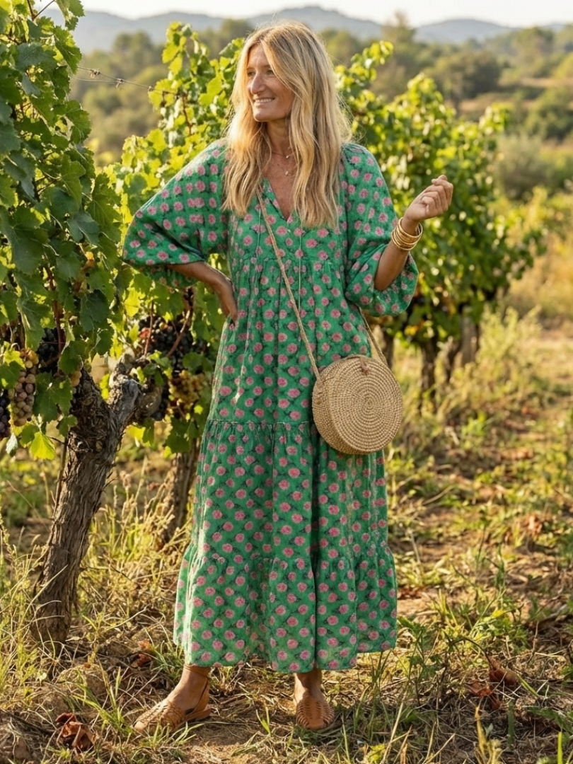 This dress features a soft floral pattern with a flowing, easy shape. The fabric is lightweight and moves gently with the body, making it comfortable for all-day wear. It suits everyday outings, relaxed gatherings, and warm weather use.